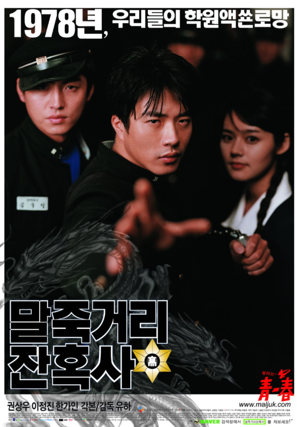 영화 '말죽거리 잔혹사'는 1978년 유신 정권 말기, 서울 말죽거리(현재 양재동 일대)에 위치한 한 고등학교를 배경으로, 폭력과 억압으로 얼룩진 학교 현실 속에서 방황하는 청춘들의 아픔과 성장을 그린 액션 느와르 드라마입니다. 모범생이자 소심한 성격의 현수(권상우)는 1978년, 엄격한 군사주의 교육과 폭력적인 분위기가 팽배한 정문고등학교로 전학을 오게 됩니다. 그는 학교 짱들의 폭력과 교사들의 체벌, 그리고 입시 위주의 획일적인 교육 방식에 숨 막혀 합니다.